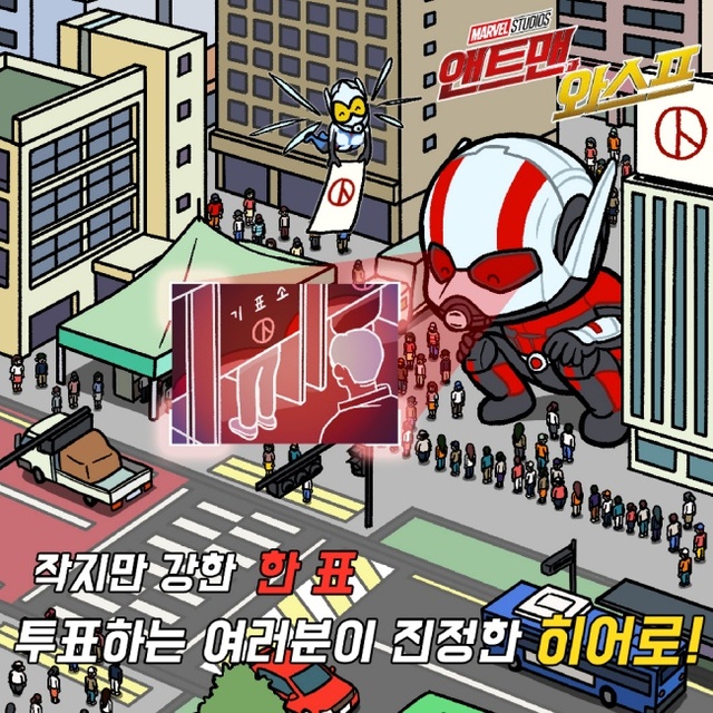 마블 코리아 공식 인스타그램 계정을 통해 순차적으로 공개된 이번 <앤트맨과 와스프>의 인스타툰은 크고 작은 사이즈로 변한 앤트맨과 와스프가 유권자들에게 투표를 독려하는 모습을 재치 있게 그려냈다.