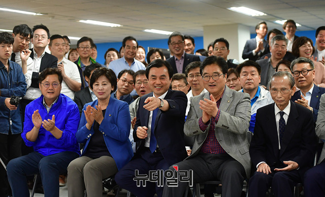 안규백 더불어민주당 상임선대위원장, 우원식 전 원내대표를 비롯한 관계자들 13일 오후 서울 종로구에 마련된 박원순 서울시장 후보 선거상황실에서 출구조사 방송을 보며 환호하고 있다.