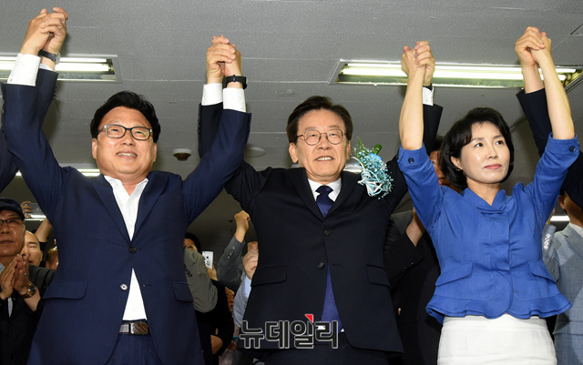 이재명 더불어민주당 경기지사 후보 내외가 13일 오후 경기 수원시 팔달구 선거사무소에서 6.13지방선거 출구조사 발표 후 만세를 하고 있다. (경기 수원=뉴데일리 공준표 기자)