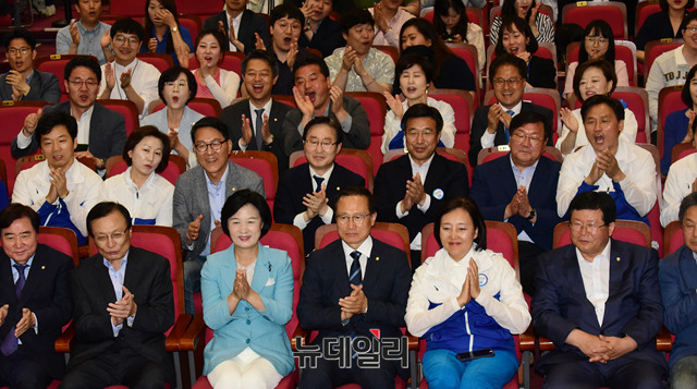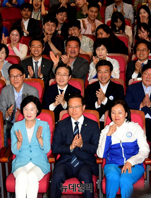 추미애 더불어민주당 대표 등 지도부가 13일 오후 국회 의원회관에 만련된 개표상황실에서 6·13 지방선거 출구조사 압승을 예측하는 결과가 발표되자 환호하고 있다.