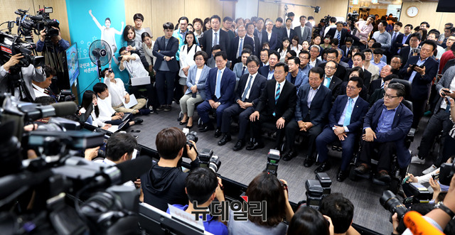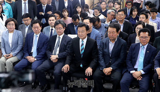 바른미래당 유승민-박주선 공동대표, 손학규 상임선대위원장 등 당지도부가 13일 오후 서울 여의도 중앙당사에서 만련된 개표상황실에서 6·13 지방선거 출구조사 결과가 발표되자 침울한 표정으로 앉아 있다.
