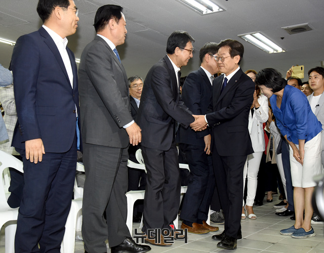 이재명 더불어민주당 경기지사 후보가 13일 오후 경기 수원시 팔달구 선거사무소에서 6.13지방선거 출구조사 발표 후 악수를 나누고 있다. (경기 수원=뉴데일리 공준표 기자)