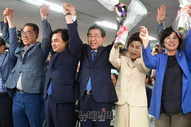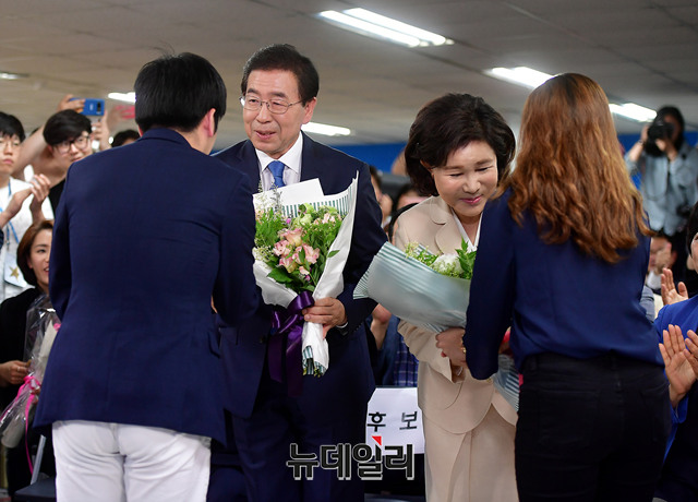 박원순 더불어민주당 서울시장 후보가 13일 오후 당선이 확실시 되자 서울 종로구에 마련된 선거캠프를 찾아 축하 꽃다발을 들고 지지자들의 축하를 받고 있다.