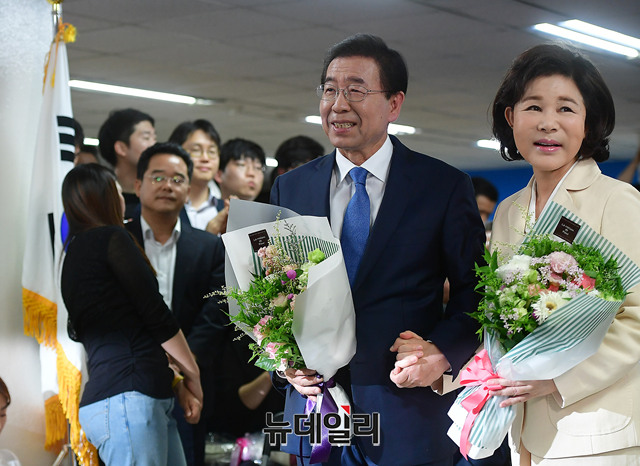 박원순 더불어민주당 서울시장 후보가 13일 오후 당선이 확실시 되자 서울 종로구에 마련된 선거캠프를 아내 강난희 여사와 함께 찾아 당선소감을 밝히고 있다.