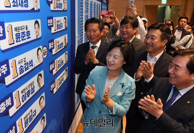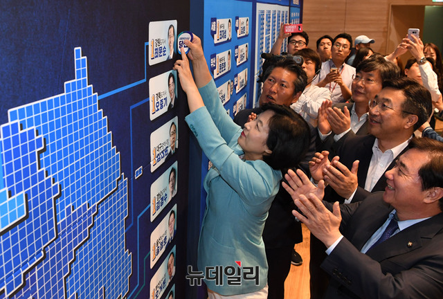 추미애 더불어민주당 대표가 13일 오후 국회 의원회관에 마련된 선거상황실을 찾아 선거개표종합상황판에 광역단체장 당선 표를 붙이고 있다.