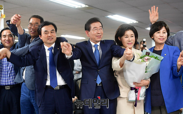 박원순 더불어민주당 서울시장 후보(가운데)와 캠프 관계자들이 13일 오후 서울 종로구에 마련된 선거캠프에서 당선이 확실시 되자 손을 맞잡고 지지자들에게 화답하고 있다.