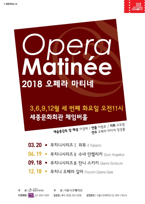 한편, 오페라 마티네는 3부작은 '외투', '수녀 안젤리카', '잔니 스키키'로 이뤄져있다. 9월 18일 3부작의 마지막 이야기인 '잔니 스키키'로 희극 오페라를 선보이며, 12월 18일엔 푸치니 오페라의 주요 아리아를 모은 갈라 콘서트로 꾸며진다.