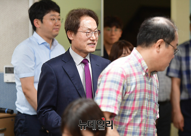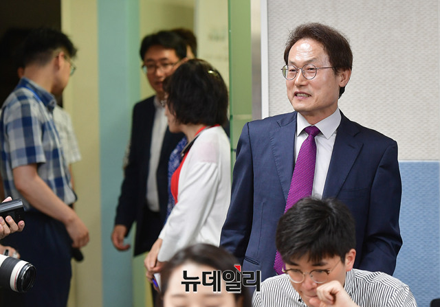 조희연 서울시교육감 당선자가 14일 오전 서울 종로구 서울시교육청에서 교육감 당선 기자간담회에 입장하고 있다. 조 당선자는 6.13지방선거에서 46.6%로 서울시교육감에 당선됐다.