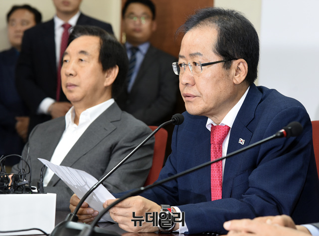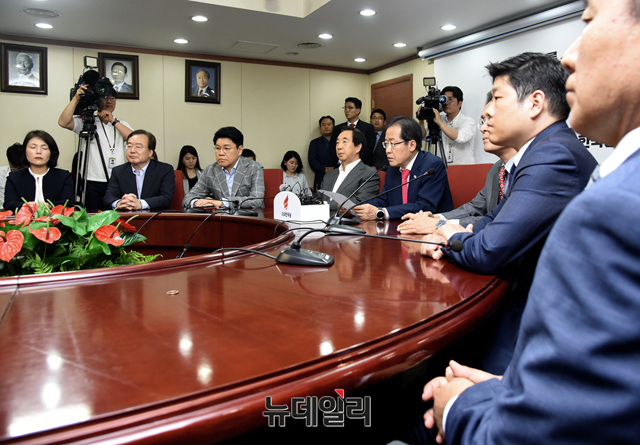 홍준표 자유한국당 대표가 14일 오후 서울 여의도 중앙당사에서 열린 최고위원회의에 참석해 당 대표직 사퇴를 선언하고 있다.