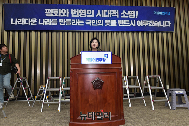 추미애 더불어민주당 상임선대위원장이 14일 오후 국회 본청에서 열린 의원총회에 감사 인사를 하고 있다.