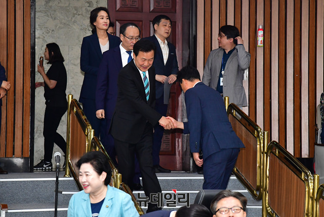 손학규 바른미래당 중앙선거대책위원장이 15일 오전 서국회에서 열린 중앙선거대책위원회 해단식에 참석하기 위해 입장하고 있다.