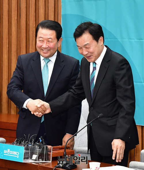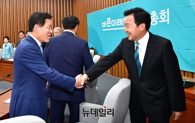 손학규 바른미래당 중앙선거대책위원장이 15일 오전 서국회에서 열린 중앙선거대책위원회 해단식에 참석해 의원들과 악수를 나누고 있다.