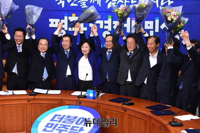 6.13지방선거 더불어민주당 광역단체장 당선자들이 15일 오전 국회에서 열린 '나라다운 나라, 든든한 지방정부 실현을 위한 국민과의 약속 선포식'에서 기념사진을 찍고 있다.이춘희 세종시장(왼쪽부터), 홍철호 울산시장, 허태정 대전시장, 이용섭 광주시장, 박남춘 인천시장, 오거돈 부산시장, 박원순 서울시장, 추미애 대표, 홍영표 원내대표, 이재명 경기도지사, 최문순 강원도지사, 이시종 충북지사, 양승조 충남지사, 송하진 전북지사, 김영록 전남지사.