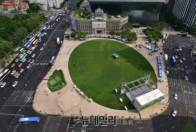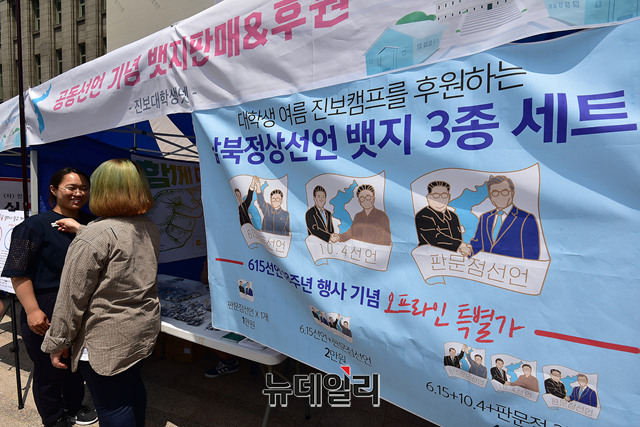진보대학생넷 회원들이 15일 오전 서울광장에서 열린 6.15 18주년기념, 평화통일박람회에서 공동선언 기념 배지 3종을 선보이고 있다. (김대중 전 대통령과 김정일의 얼굴이 들어간 6.15공동선언, 노무현 전 대통령과 김정일의 얼굴이 들어간 10.4선언, 문재인 대통령과 김정은의 얼굴이 들어간 판문점선언 기념 배지)평화통일박람회는 6.15공동선언발표 18주년을 기념해 6.15 서울본부 및 각계 시민단체가 주최했다. 오후 7시 부터 서울광장에서 본 행사가 진행된다.이 행사는 민노총, 마트산업노동조합, 마트산업노동조합 홈플러스지부, 부루벨코리아노동조합, 민노총서울본부, 정보경제연맹노동조합, 학교비정규직노동조합, 서울노동광장이 후원했다.