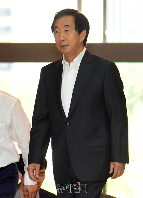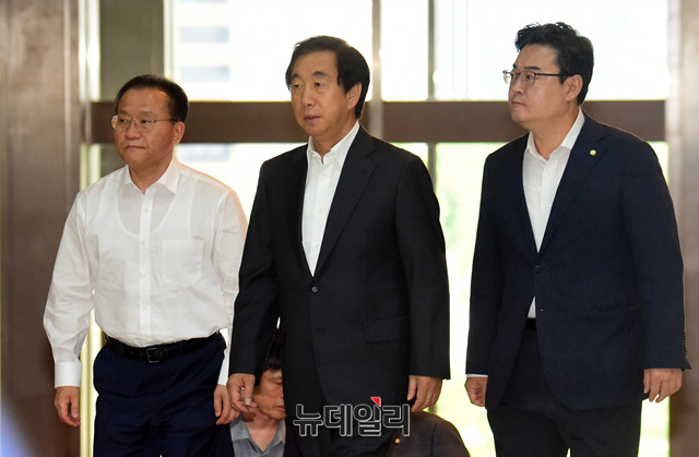 김성태 자유한국당 원내대표가 15일 오후 국회에서 열린 비상의원총회에 참석하기 위해 입장하고 있다.