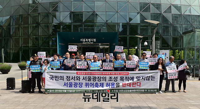 바른성문화를위한국민연합을 비롯한 30개 시민단체가 15일 오전 서울시청 앞에서 서울광장 동성애 퀴어축제 허용을 반대하는 기자회견을 진행하고 있다.