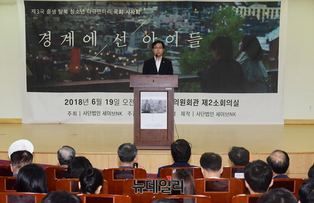 김영우 자유한국당 의원이 19일 오전 국회 의원회관에서 중도입국 탈북청소년의 이야기를 다룬 다큐멘터리 '경계에 선 아이들' 상영회에서 축사를 하고 있다.