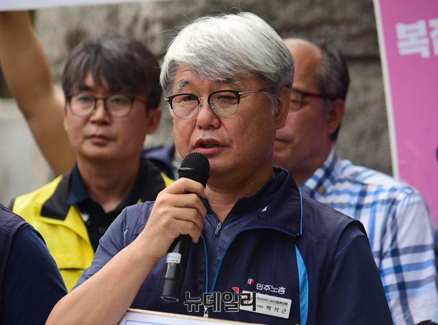 한국노총과 민주노총 관계자들이 19일 오후 서울 종로구 헌법재판소에서 열린 '개악 최저임금법 위헌청구소송 기자회견'을 갖고 있다.