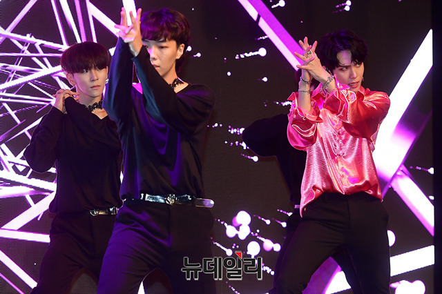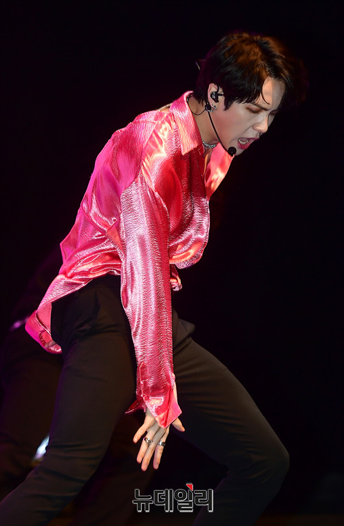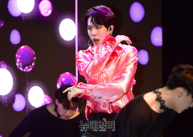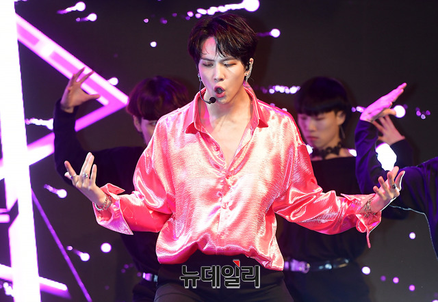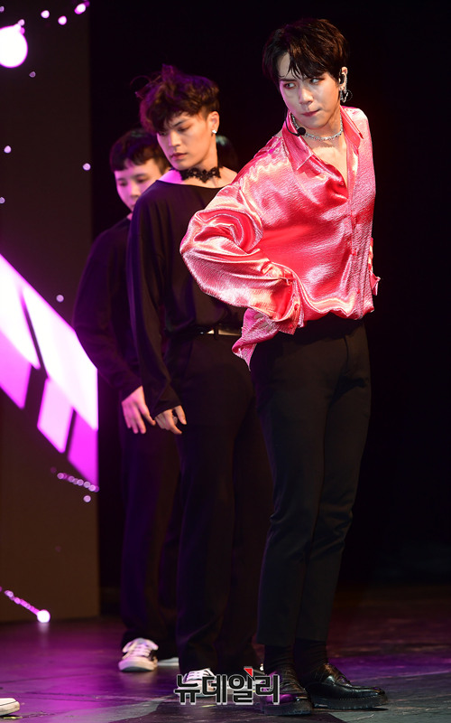 가수 김동한이 19일 오후 서울 마포구 신한판스퀘어에서 솔로 데뷔 앨범 'D-DAY(디데이)' 쇼케이스에서 타이틀곡을 선보이고 있다.