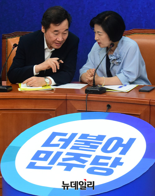 추미애 더불어민주당 대표와 이낙연 국무총리가 20일 오전 국회에서 열린 고위당정청협의회에서 참석해 대화를 나누고 있다.