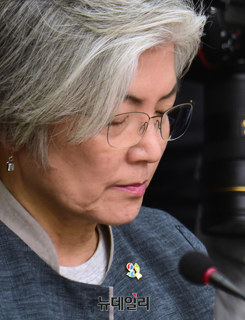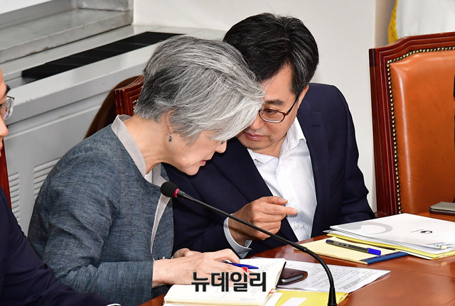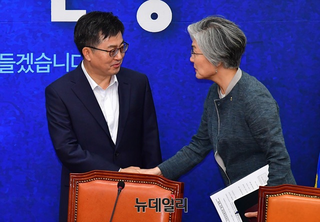 김동연 기획재정부 장관 겸 경제 부총리와 강경화 외교부 장관이 20일 오전 국회에서 열린 고위당정청협의회에서 참석해 대화를 나누고 있다.