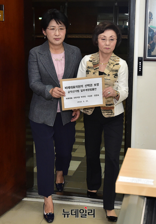 바른미래당 장정숙-박주현 의원이 20일 오전 국회 의안과에 정당의 합당-분당시 비례대표의원의 정당 선택권을 보장하는 내용의 공직선거법 일부개정법률안을 제출하고 있다.