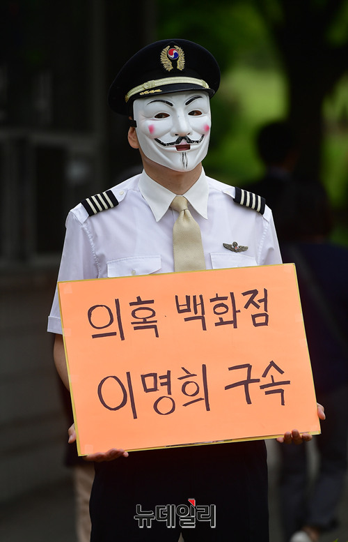 [포토] 가면 쓴 대한항공 직원 "이명희 구속"