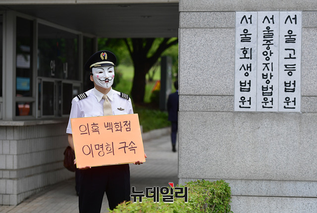 이명희 전 일우재단 이사장의 구속을 촉구하는 대한항공 관계자가 20일 오전 이 전 이사장의 영장심사가 진행되는 서울중앙법원 앞에서 구속을 촉구하는 손피켓을 들고 있다. 이 전 이사장은 외국인 가사도우미 불법 고용 혐의를 받고 있다.
