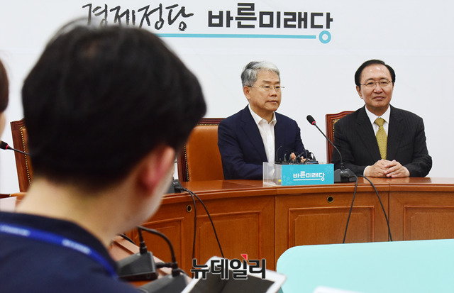 김동철 바른미래당 비상대책위원장이 20일 오후 국회에서 노회찬 정의당 원내대표 예방을 받고 대화를 나누고 있다.