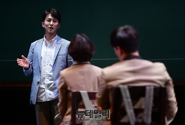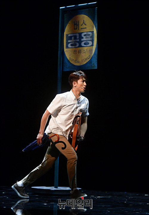 배우 강필석이 20일 오후 서울 종로구 세종문화회관 M시어터에서 열린 뮤지컬 '번지 점프를 하다' 프레스콜에서 하이라이트 장면을 시연하고 있다.