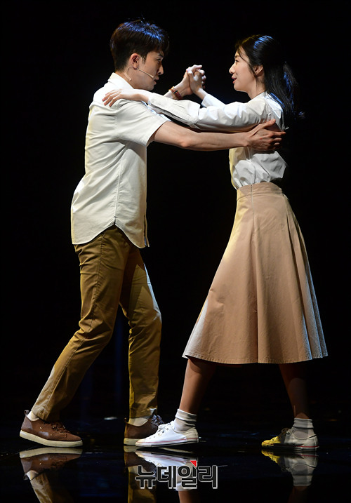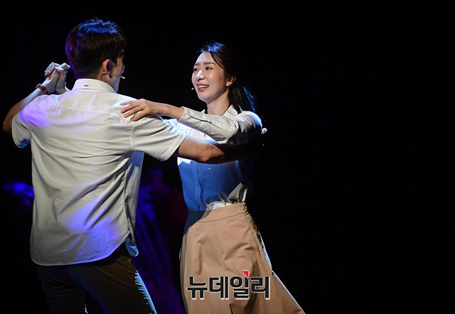 배우 강필석, 김지현이 20일 오후 서울 종로구 세종문화회관 M시어터에서 열린 뮤지컬 '번지 점프를 하다' 프레스콜에서 하이라이트 장면을 시연하고 있다.
