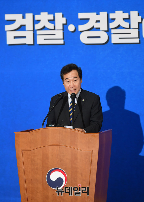 이낙연 국무총리가 21일 오전 서울 종로구 정부서울청사 별관 국제회의장에서 '검·경 수사권 조정 합의문'에 앞서 입장하고 있다.
