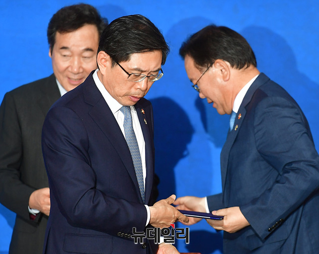 박상기 법무부 장관과 김부겸 행정안전부 장관이 21일 오전 서울 종로구 정부서울청사 별관 국제회의장에서 이낙연 국무총리, 조국 청와대 민정수석이 참석한 '검·경 수사권 조정 합의문' 서명식에서 합의문을 건네고 있다.