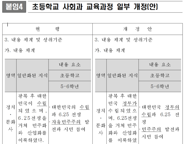 자유민주주의→ 민주주의, 대한민국 수립→ '정부 수립', '한반도 유일 합법 정부' 서술은 삭제