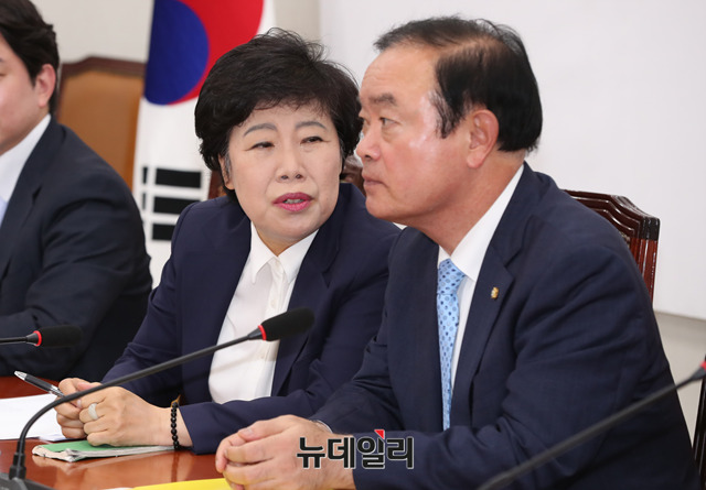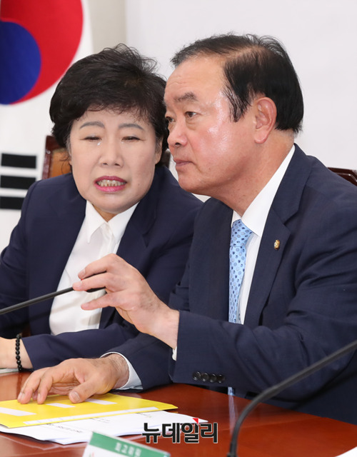 민주평화당 조배숙 대표와 장병완 원내대표가 22일 오전 국회에서 열린 민주평화당 최고위원-국회의원 연석회의에서 대화를 나누고 있다.