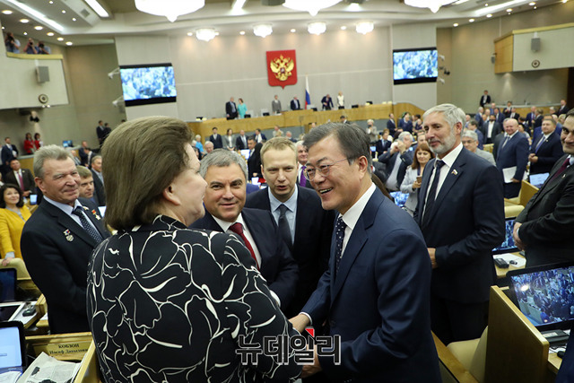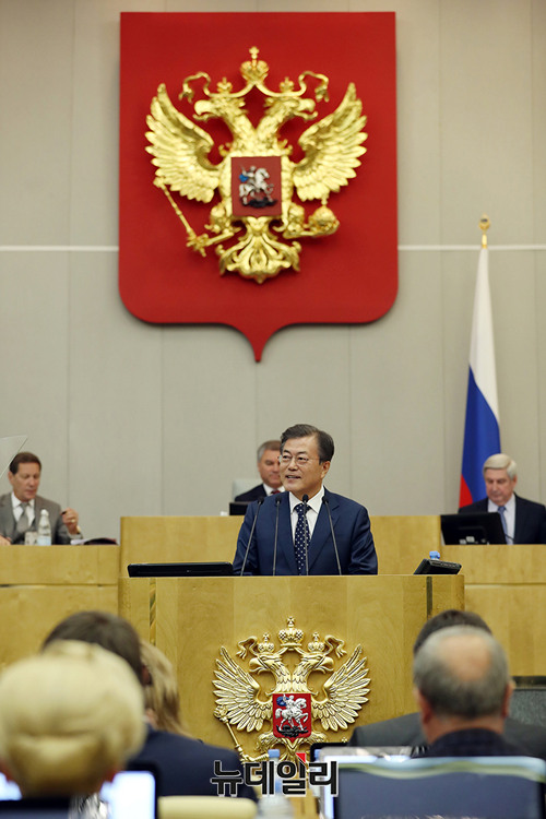문재인 대통령이 21일 오후(현지시간) 대한민국 대통령 최초로 러시아 연방하원의회에서 연설했다. 문 대통령은 "한반도 평화체제 구축으로 남·북·러 3국의 경제협력이 확대될 것"이라며 "한국과 북한이 유라시아의 새로운 가능성에 동참하고 공동번영을 이뤄내는 데 함께하길 바란다"고 밝혔다. (사진=청와대)