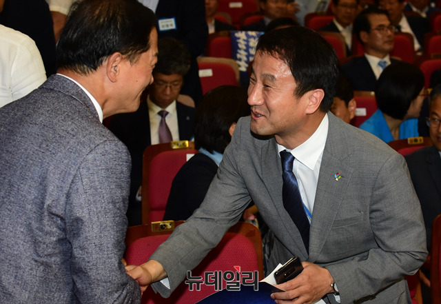 한병도 청와대 정무수석이 22일 오후 국회에서 열린 더불어민주당 '6.13 지방선거 기초단체장 당선자 대회'에 참석해 대화를 나누고 있다.