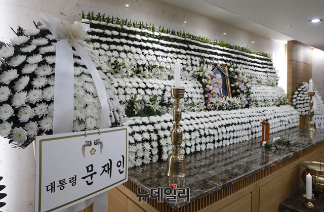 김종필 전 국무총리가 향년 92세로 별세한 23일 오후 서울 아산병원 장례식장에 마련된 빈소에 영정이 놓여 있다.