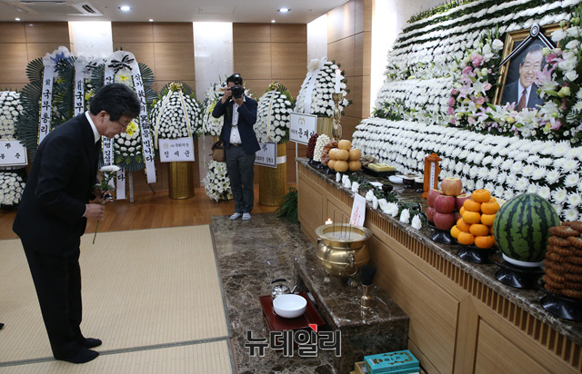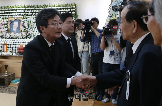 김종필 전 국무총리가 향년 92세로 별세한 23일 오후 서울 아산병원 장례식장에 마련된 빈소에 유승민 바른미래당 전 대표가 조문하고 유족들을 위로하고 있다.