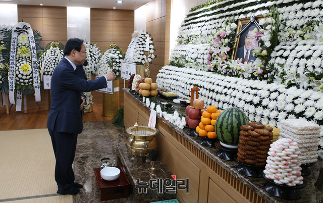 김종필 전 국무총리가 향년 92세로 별세한 23일 오후 서울 현대 아산병원 장례식장에 마련된 빈소에 이주영 자유한국당 의원이 조문을 있다.
