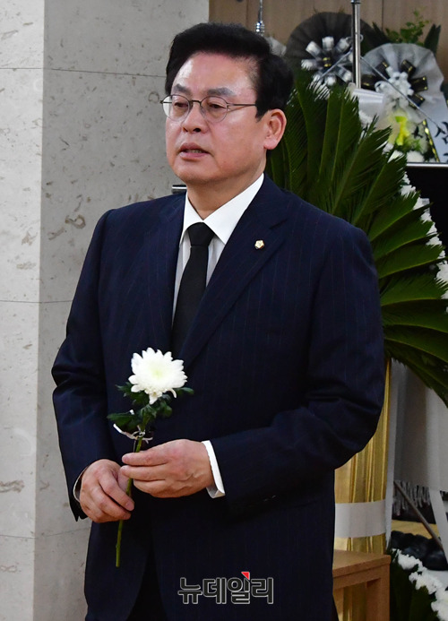 김종필 전 국무총리가 향년 92세로 별세한 23일 오후 서울 아산병원 장례식장에 마련된 빈소에 정우택 전 자유한국당 원내대표가 조문하고 있다.