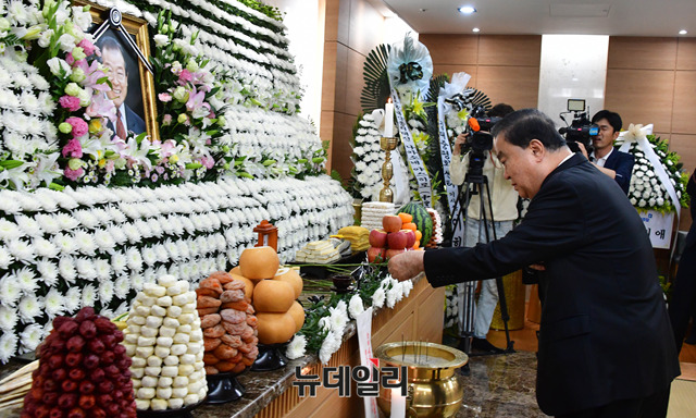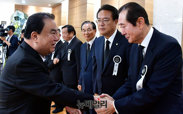 김종필 전 국무총리가 향년 92세로 별세한 23일 오후 서울 현대 아산병원 장례식장에 마련된 빈소에 문희상 더불어민주당 의원이 조문하고 있다.