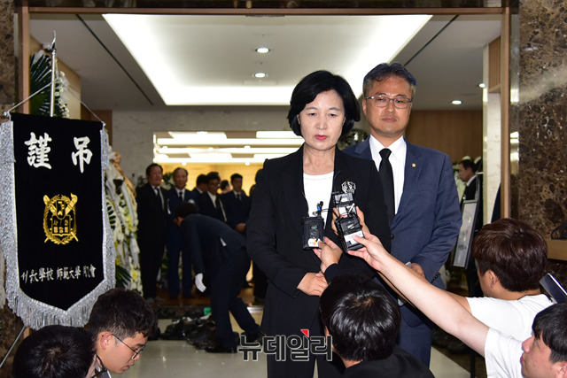 추미애 더불어민중당 대표가 23일 오후 서울 송파구 서울아산병원 장례식장에 마련된 김종필 전 국무총리의 빈소 조문을 마친 후 취재진의 질의에 답변하고 있다.