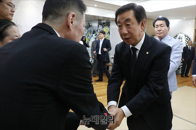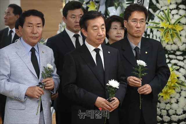 김종필 전 국무총리가 향년 92세로 별세한 23일 오후 서울 아산병원 장례식장에 마련된 빈소에 김성태 자유한국당 대표 권한대행이 조문하고 있다.