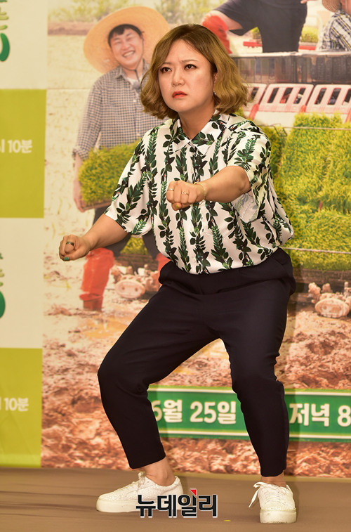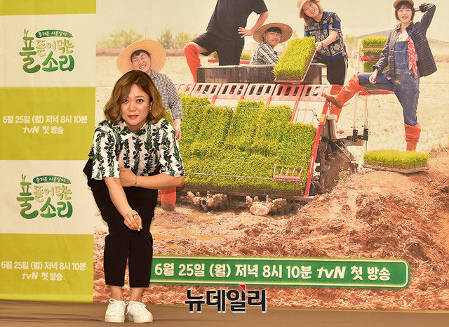 개그우먼 김숙이 25일 오후 서울 마포구 스탠포드 호텔에서 열린 tvN 예능 '풀 뜯어먹는 소리(연출 엄진석)' 제작보고회에서 포토타임을 갖고 있다.