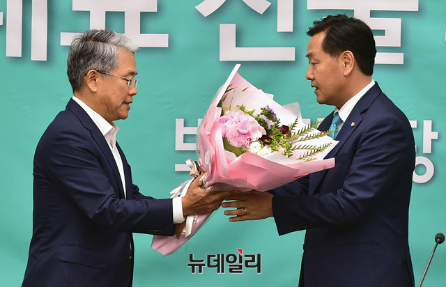 김관영 바른미래당 신임 원내대표가 25일 오후 국회에서 열린 바른미래당 원내대표 선출을 위한 의원총회에서 당선된 후 꽃다발을 들고 있다.