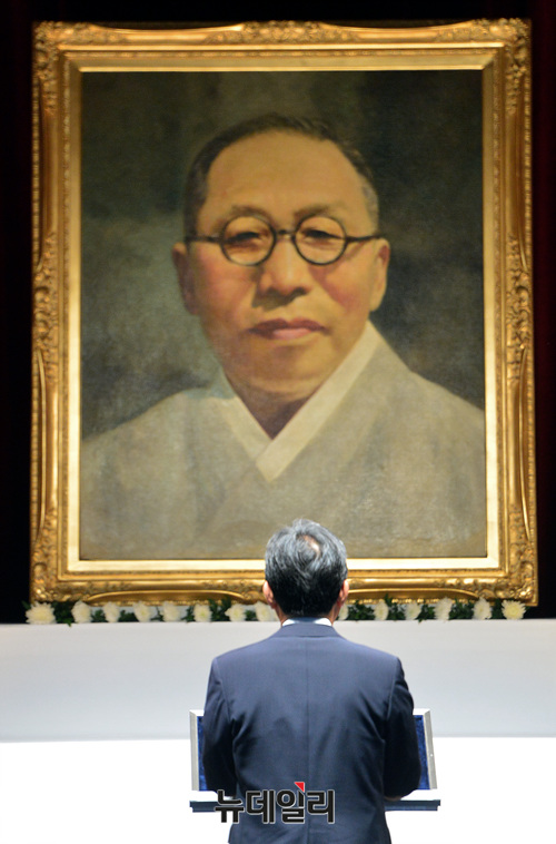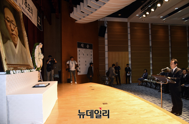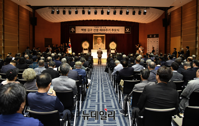 정세균 전 국회의장이 26일 오전 서울 용산구 백범김구기념관에서 열린 '김구 제69주기 추모식'에 참석해 추도사를 하고 있다.