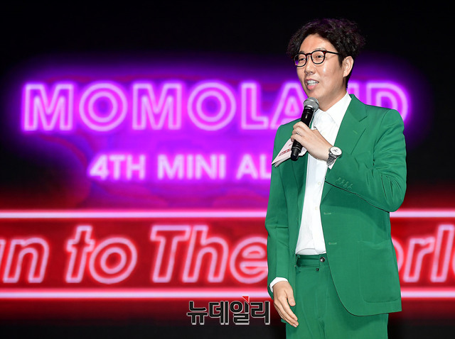 개그맨 김영철이 26일 오후 서울 용산구 블루스퀘어에서 열린 걸그룹 모모랜드 새 미니앨범 'Fun to The World(펀 투 더 월드)' 쇼케이스에서 모모랜드를 소개하고 있다.