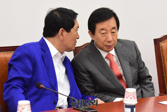 김성태 자유한국당 대표 권한대행 겸 원내대표와 안상수 혁신 비상대책위원회 준비위원장이 29일 오전 국회에서 열린 원내대책회의에서 대화를 나누고 있다.
