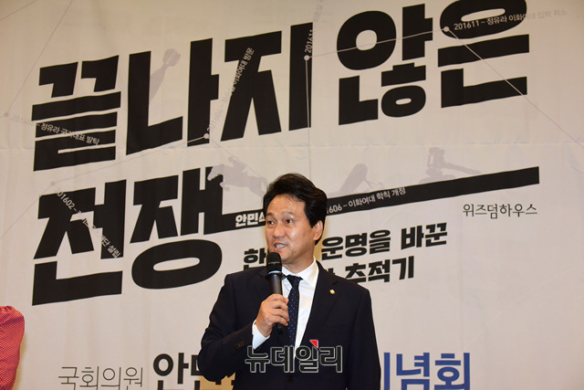 안민석 더불어민주당 의원이 29일 오후 국회 헌정기념관에서 열린 본인의 저서 '끝나지 않은 전쟁' 출판기념회에서 인사말을 하고 있다.